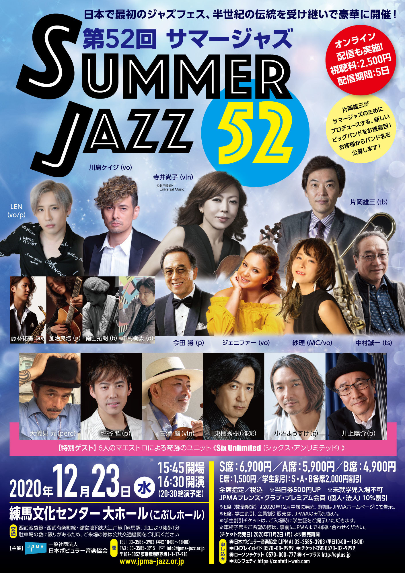 | 2020年9月30日 | 【新日程決定のお知らせ】《第52回 サマージャズ》延期開催の日程が決定いたしました。ご購入済みのチケットに関してのご案内は[こちら]をご確認ください。 |