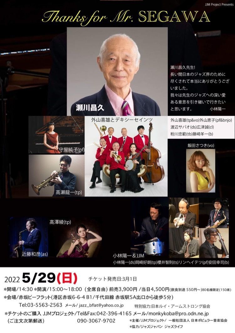 | 2022年2月24日【NEW】 | 《Thanks for Mr. SEGAWA》開催決定。日本ジャズ界の発展に尽くした、故・瀬川昌久先生に捧げるライブを開催いたします。 |