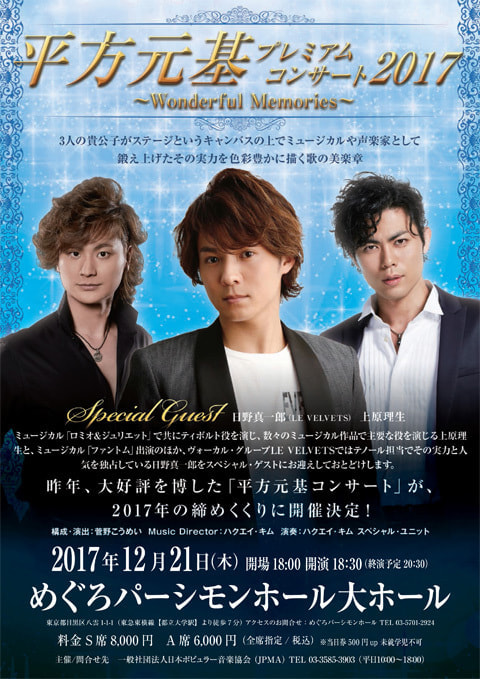 平方元基(ひらかた げんき)/ 1985年生まれ、福岡県出身。身長184cm、血液型AB型。08年TVドラマで俳優デビュー後、数々のドラマ、舞台、映画に出演。11年「ロミオ&ジュリエット」でミュージカル初舞台を踏み、以降、人気と実力を兼ね備えたミュージカル界の新星として活躍中。過去の主な出演作に「エリザベート」「サンセット大通り」「ダンス・オブ・ヴァンパイア」「王家の紋章」「スカーレット・ピンパーネル」「レディ・ベス」等。今後の出演作品は2018年1月シアタークリエ10周年記念公演「TENTH」。ミュージカルでは3月「舞妓はレディ」、6月「銀河鉄道999」ほかに出演予定。今最も勢いに乗るミュージカル俳優として注目されている。