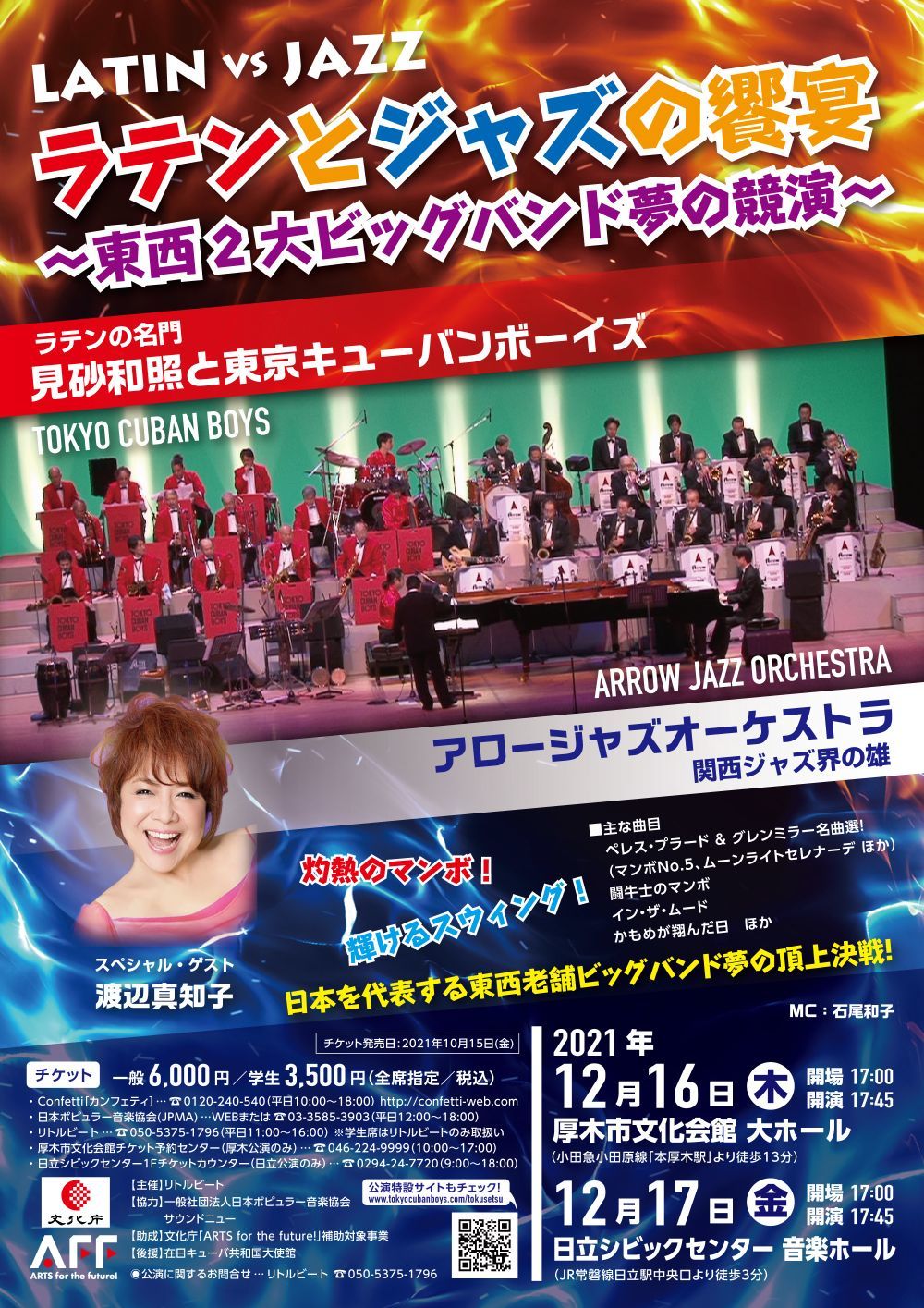 関西ジャズ界の名門=アロージャズオーケストラは、グレン・ミラーの美しい名曲と軽快なスウィング・ナンバーの数々を。一方のラテン・ビッグ・バンド界のパイオニア=東京キューバンボーイズはラテンの王様ペレス・プラードをはじめ灼熱のラテン・ナンバーで応戦します。さらに実力派シンガーの渡辺真知子を迎え、ラテン・ジャズの懐かしいヒット・ナンバーで華を添えます。両者譲らぬ大迫力の演奏、ビッグ・バンドならではの豪華絢爛なステージに是非ご期待ください!