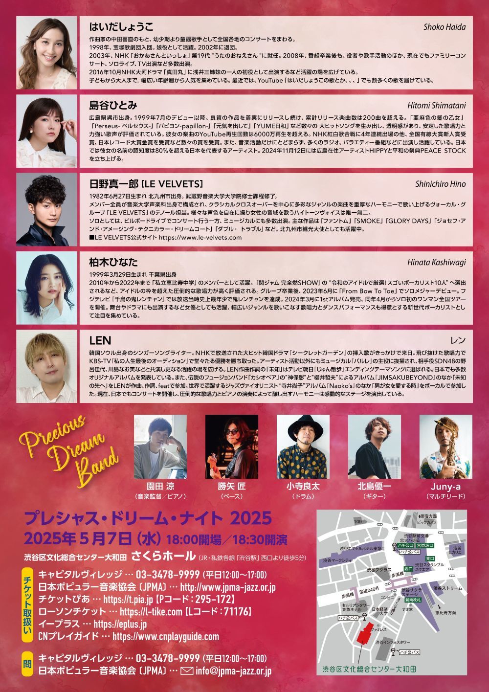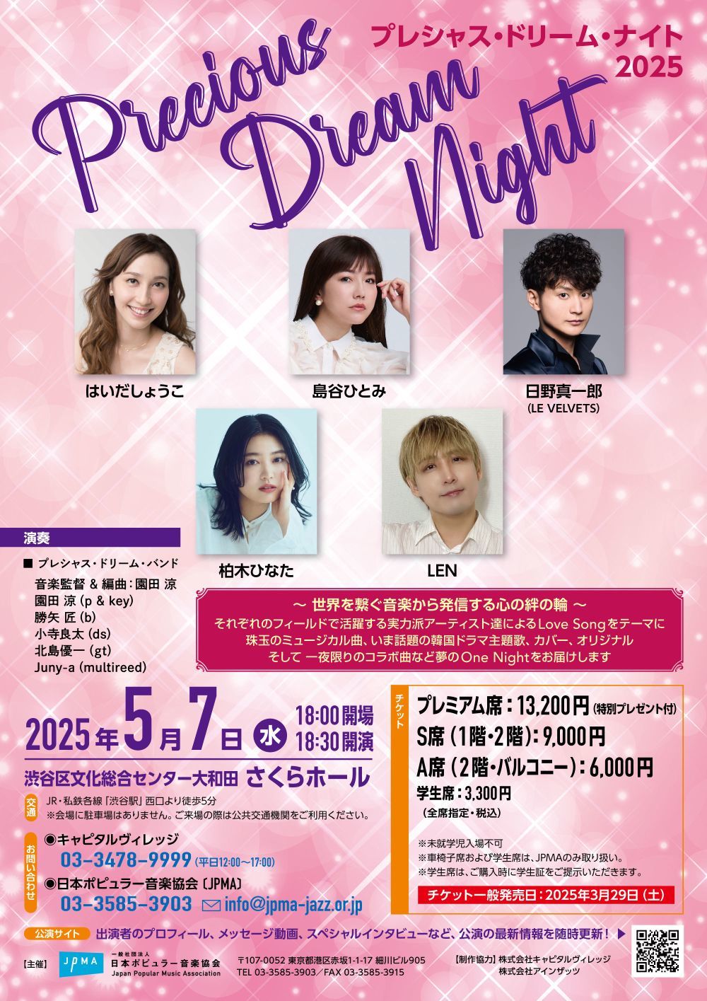 | 2025年5月8日 | 【御礼】5月7日、多くのお客様をお迎えし、《Precious Dream Night 2025》を盛大に開催することができました。コンサートの実現にご協力いただきました出演者・関係者に御礼を申し上げます。そして、ご来場いただきました沢山のお客様に心より感謝を申し上げます。 |