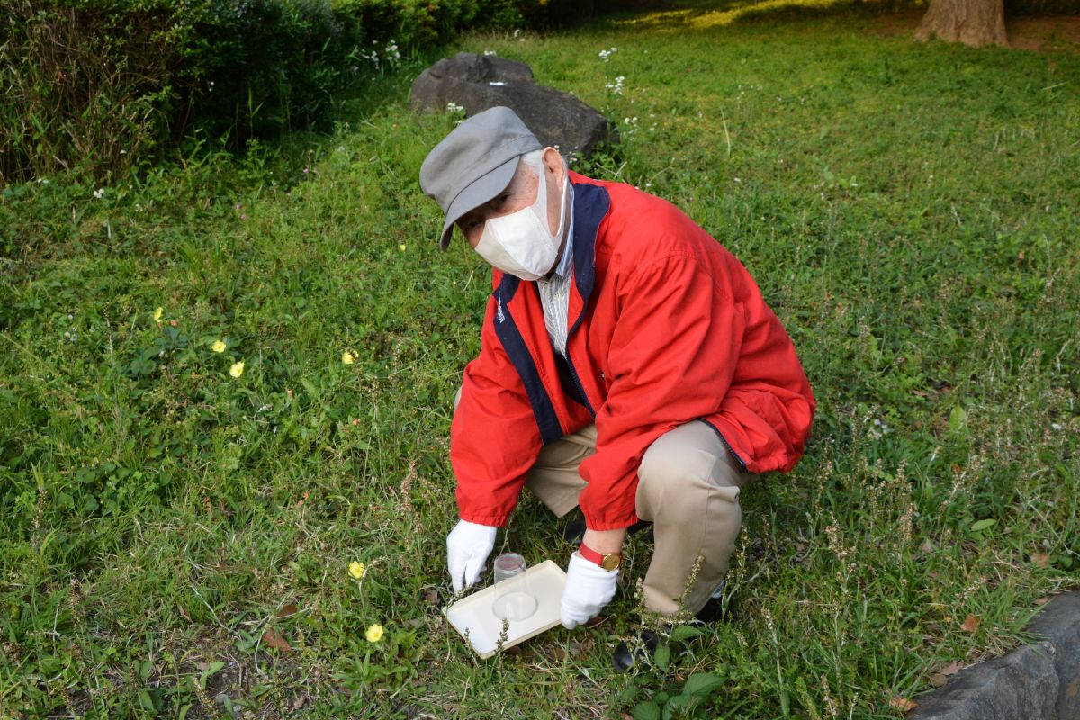 帽子とマスクと白手袋で武装し、女王アリを入れたプラスチックのカップを持った北村英治は、誰が見ても「怪しいお爺さん」でした(笑)