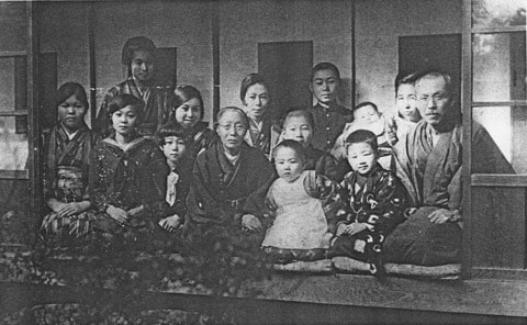 9人兄弟の末っ子、生まれたての北村英治(右端で母に抱かれて、渋谷の北村家にて)